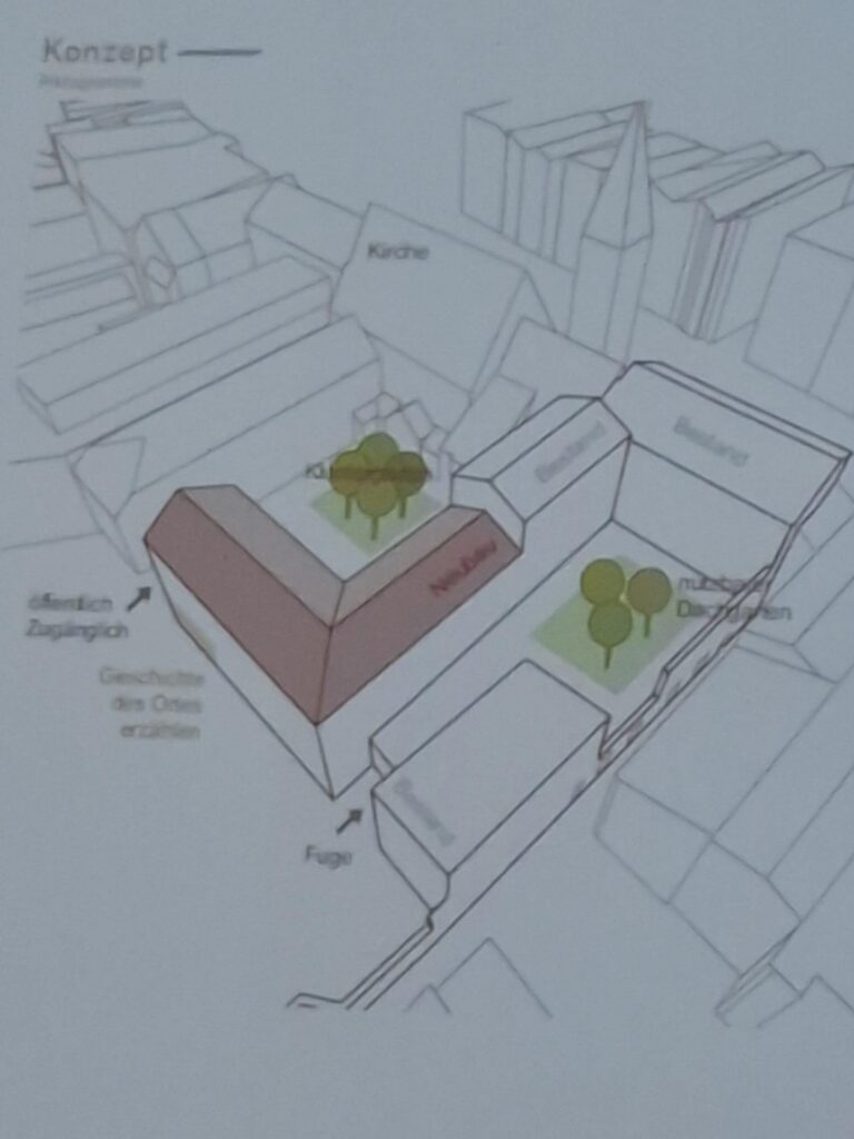 Die präsentierte Visualisierung vermittelte zunächst den Eindruck eines frei zugänglichen Gartens. Bei genauerer Betrachtung zeigt sich jedoch, dass ein erheblicher Teil der bestehenden Grünflächen und Bäume überbaut würde. Einer der als „Garten“ bezeichneten Bereiche ist als Dachgarten mit Kübelbepflanzung auf einem Erdgeschossbau vorgesehen. Inwiefern diese Gestaltung mit den Anforderungen des Denkmalschutzes sowie einer gemeinschaftlichen Nutzung vereinbar ist, muss noch geprüft werden.